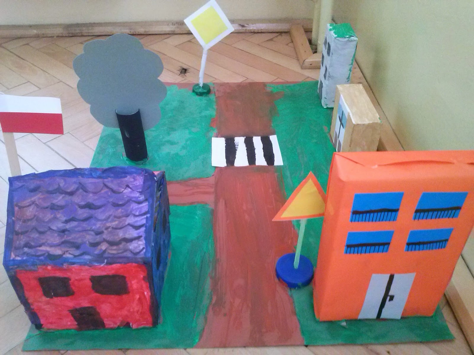 Dzięki naszym kochanym rodzicom zaś, którzy włączyli się w kształtowanie postaw społecznych oraz zw. z bezpieczeństwem, tworząc w domu elementy tj. domki, samochody, znaki drogowe stworzyliśmy dziś razem z dziećmi makietę ruchu drogowego. A to efekty naszych twórczych inspiracji oraz zabaw.